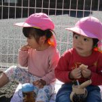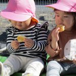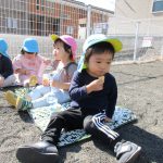 みんなで並んで座り、ピクニック気分で楽しいおやつタイムに