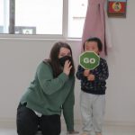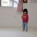 ストップ、ゴーの号令を掛けたいお友達が札を持って