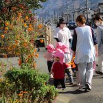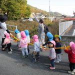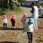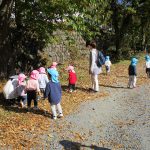 少し遅れて1・2歳児さんも出発、念のためお散歩カーも持って行きましたが