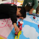 男の子達は先生と一緒にブロックで線路や鉄橋を作って