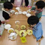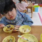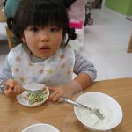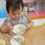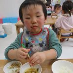 自分で食具を使って食べています(*^_^*)