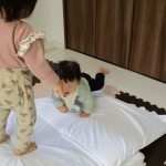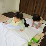 0歳児さんはお布団のお山で遊びました。