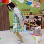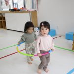 お友達と上手にフラフープの電車に乗って