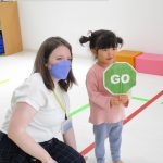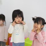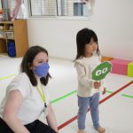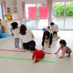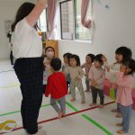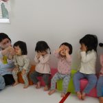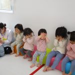 なっちゃん先生がカードを隠す間、子ども達は目隠しをして