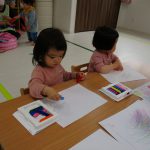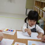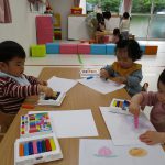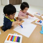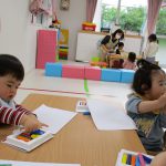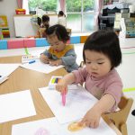 遊びが始まると1歳児さんはお絵描きコーナーへ、