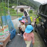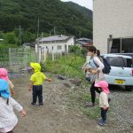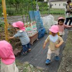 園庭に出たらまずはみんなで野菜の様子を
