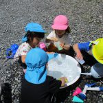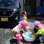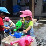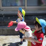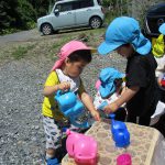 最後はみんなでタライに水を張り、じょうろも使いながら