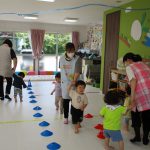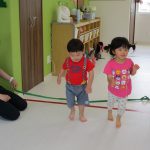 1歳児さんには難しかったので、先生と手をつないで