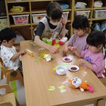 2歳児さんはのりを使って貼り、1歳児さんは