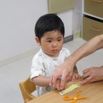 2歳児さんはのりを使って貼り、1歳児さんは