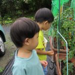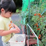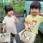 2歳児さんは晴れ間を見ながら、野菜の収穫を