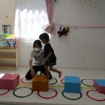 マットの上にダンボールの積木を置いて、その上を