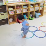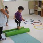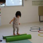 フラフープのトンネルをくぐり、平均台を乗り超えて
