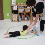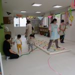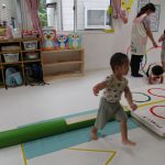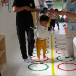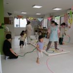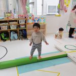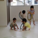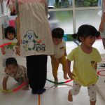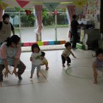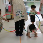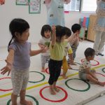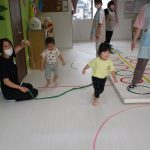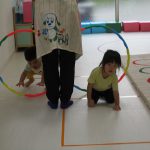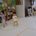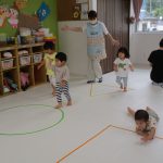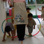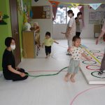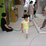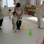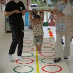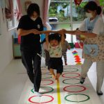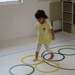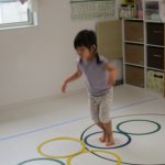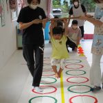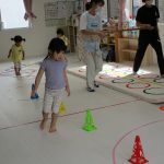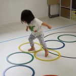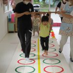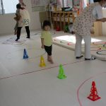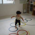 並んだ輪っかをグーグーパーで進んだり、カラーコーンの