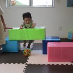 ダンボールの積木のトンネルをくぐったり、