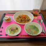今月の誕生会メニューは、焼きそば、ブロッコリーサラダ、