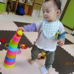 カップを重ねる玩具を先生が高く重ねてあげると、