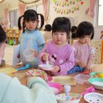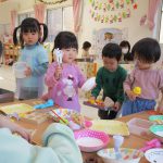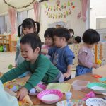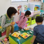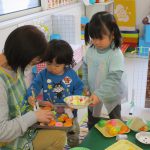 先生がお店屋さんの見本を見せると、子ども達も真似て