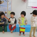 「赤鼻のトナカイ」に合わせて手作り楽器で演奏したり