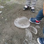 バケツの水が凍った氷を割ろうと踏んでみますが、
