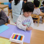 細長くちぎったお花紙を自分の息で飛ばして遊びました(*^_^*)