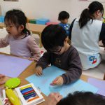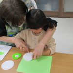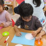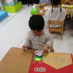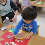 目は丸シールで貼り、ひげは先生にのりを付けてもらって