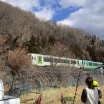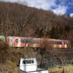 今日の電車は赤や黄色、緑や黄緑の模様が付いていて、