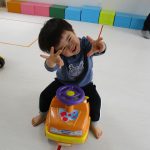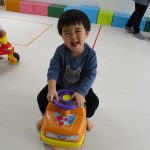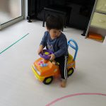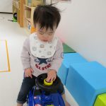 0歳児さんも車にまたがって乗ったり、ボタンを押して音楽を聞いてみたりと楽しい時間を過ごしましたよ。