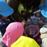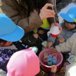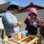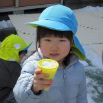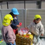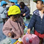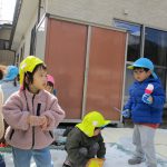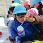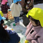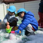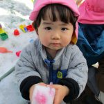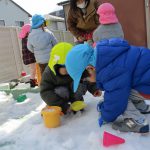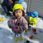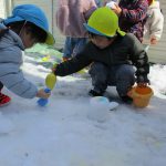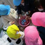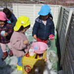 1、2歳児さんは固めになってきた雪を使って氷遊びをしましたよ。