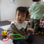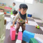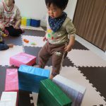 積木を丸く並べてその周りを先生と追いかけっこ!