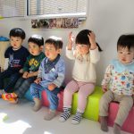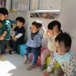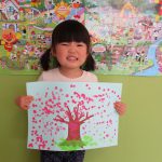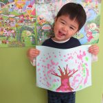 2歳児さんは食後に昨日桜のスタンプをした作品に