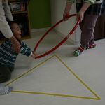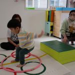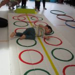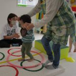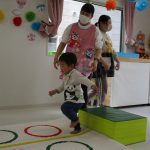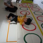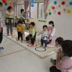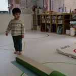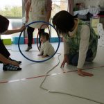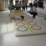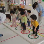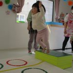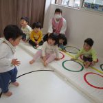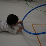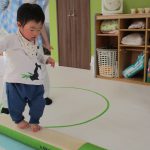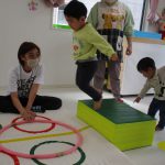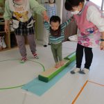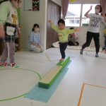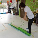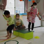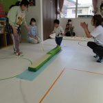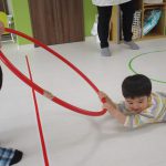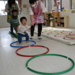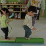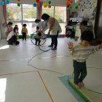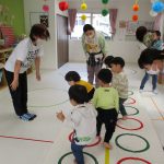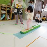 細いマットを渡ってフラフープをジャンプです。