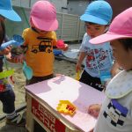 2歳児さんの女の子は先生と一緒にケーキ作りです!!