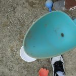 縁石を歩いている虫を見つけて、自分のシャベルに