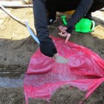 水が砂にしみこんでいかないようにビニール袋を敷いて