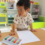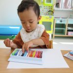 1歳児さんはクレヨンが気になる様子で、ケースから出したり