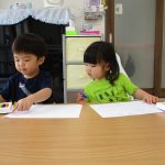 子ども達は前半はお部屋でお絵描き、後半は園庭に出て