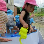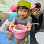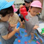 入れて泳がせて(?)いる2歳児さん、お魚を手に取り