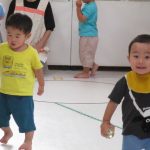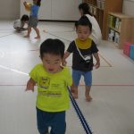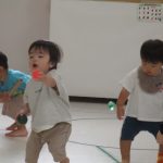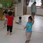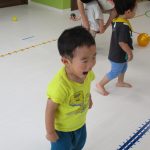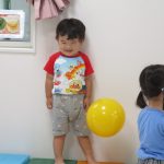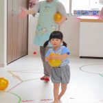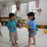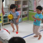 2歳児さんは先生と一緒にボールの投げっこをしたり、