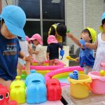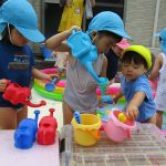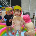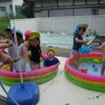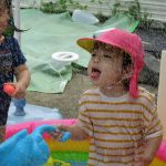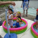 「かえるのうた」を歌うお友達、ホースで雨を降らせると