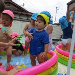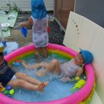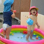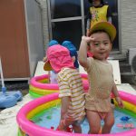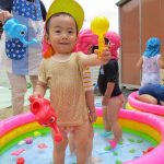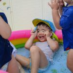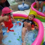 2歳児さんはプールに寝転んで足をバタバタさせて