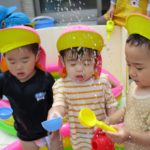 じょうろで水を体に掛けてキャーキャー喜ぶお友達、