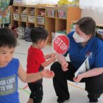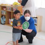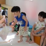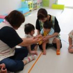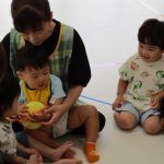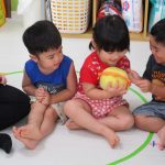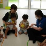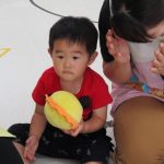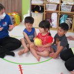 お日様のぬいぐるみをお隣のお友達にどんどん