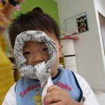 新聞紙に穴を開けてお面を作り、オバケに変身です!!