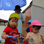 じょうろやバケツで水を掛けたりして楽しむ姿が