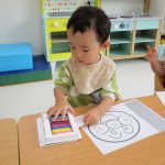ぬりえやシール貼りに満足すると、徐々にブロック