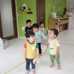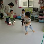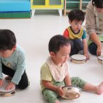 「頭 肩 膝ポン~」のお歌に合わせて、タンバリンを