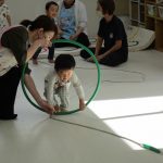 長く伸びた紐の道を歩き、途中でフラフープの