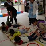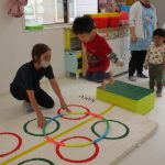 並んだフラフープをジャンプで移動して