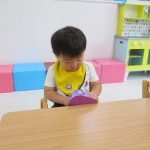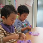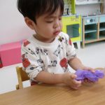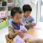 作業工程は別で、1歳児さんは紫色のお花紙を丸めて